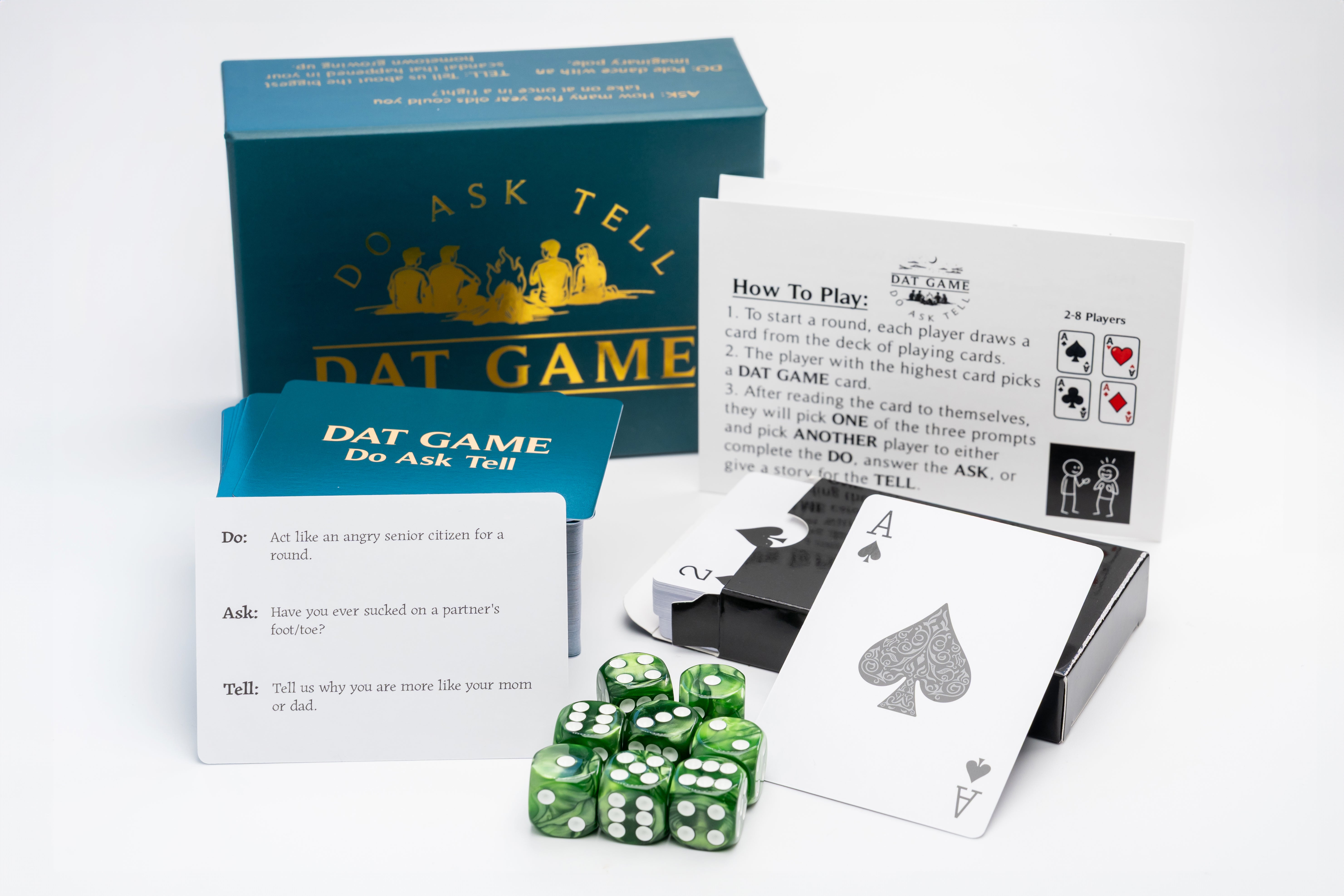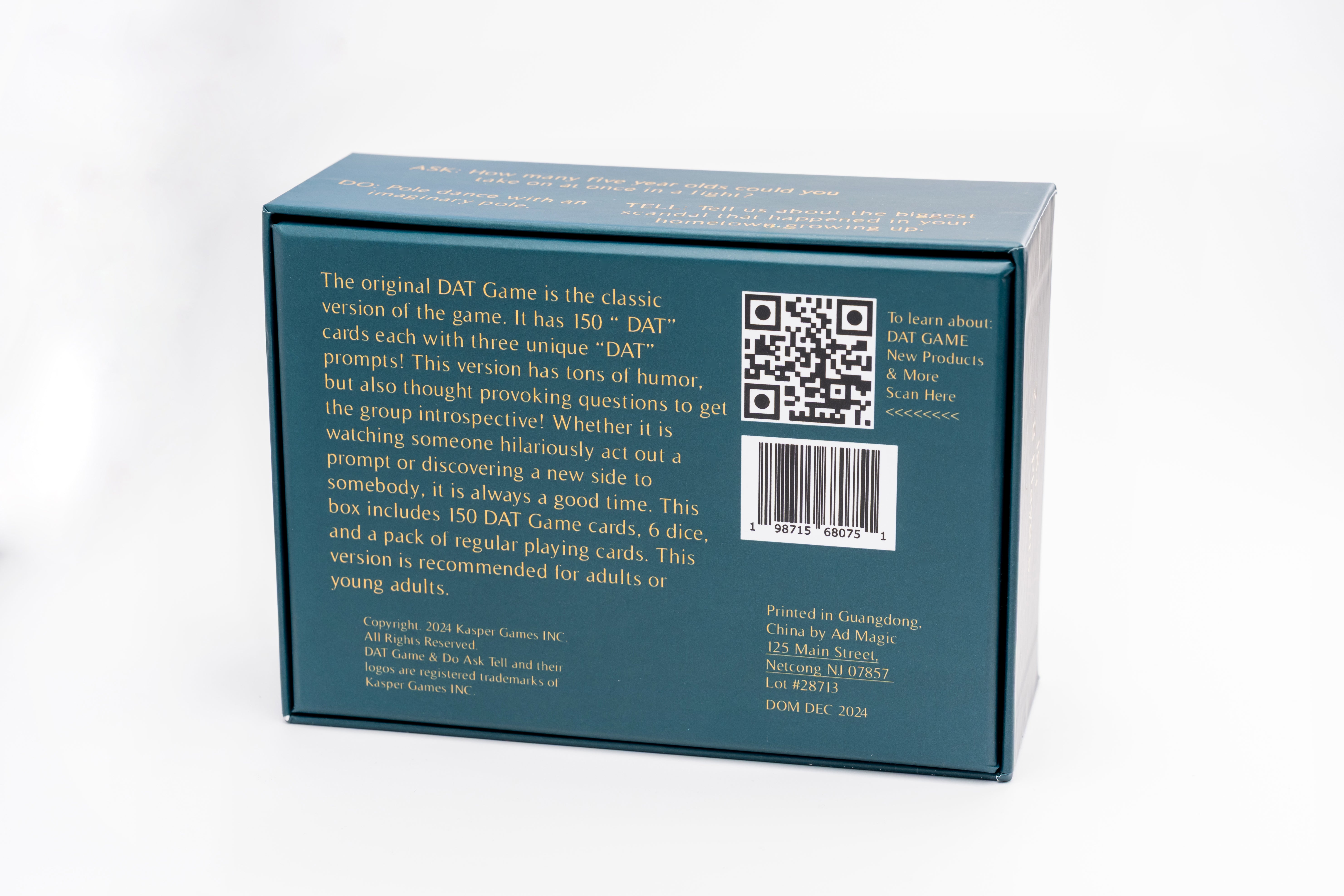The Original DAT GAME is the fun, replayable party game that accidentally gets real. It’s what happens when Cards Against Humanity, Truth or Dare and We’re Not Really Strangers have a chaotic, heartfelt love child.
