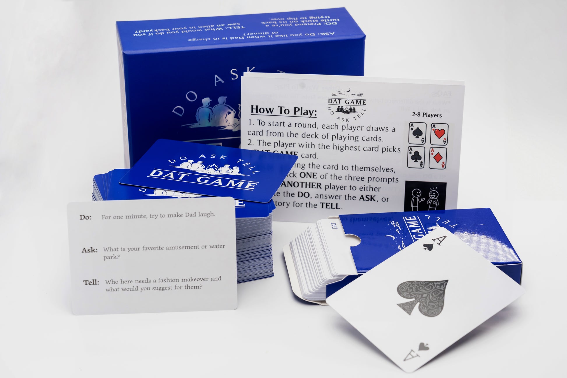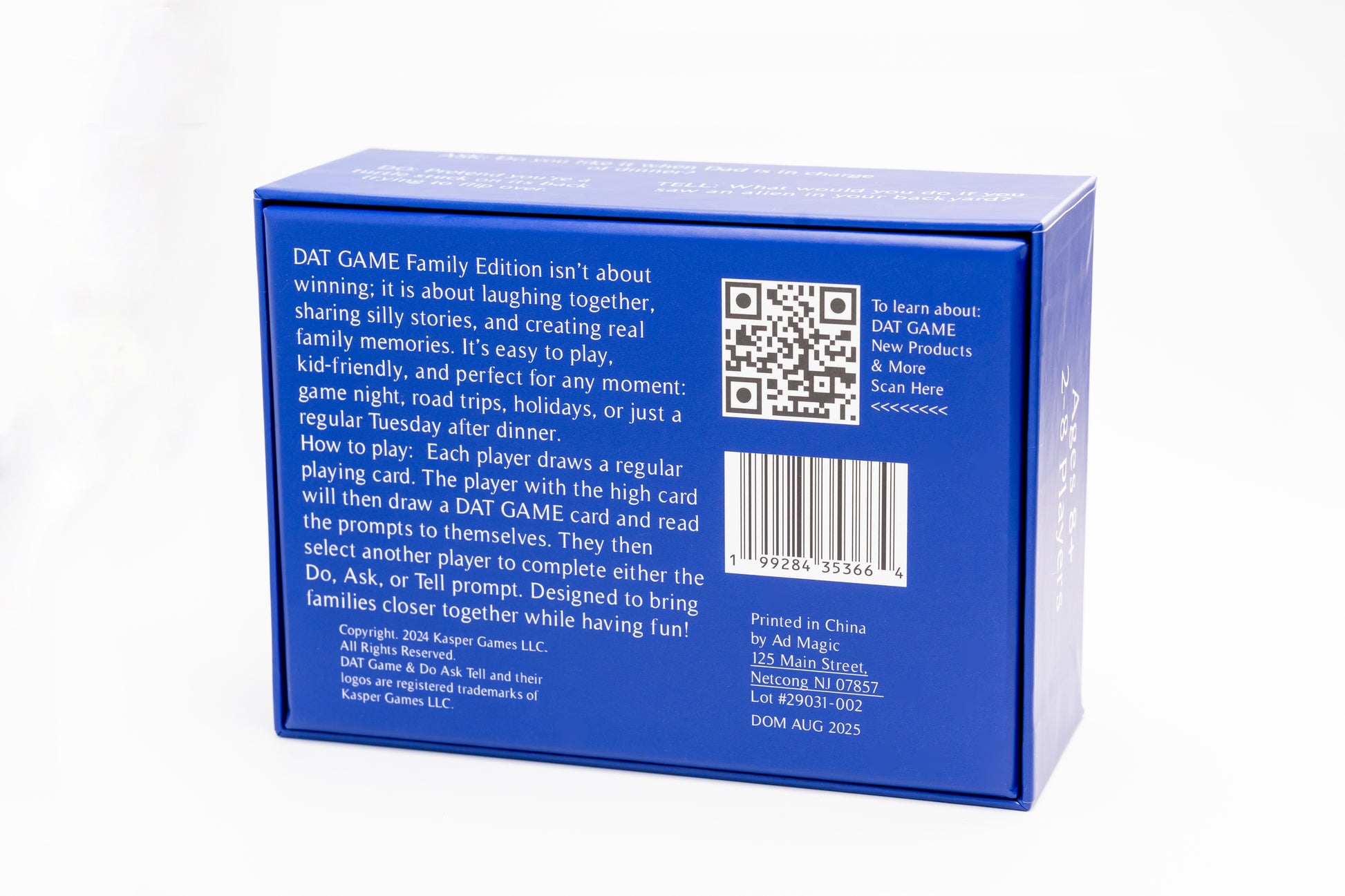 The DAT GAME: Family Pack is the fun-for-everyone edition of the original hit! Packed with 150 brand-new “DAT” cards, this version is full of silly challenges, curious questions, and heartwarming prompts perfect for all ages. Whether you're cracking up as Grandpa does a dance-off or learning your little cousin's secret dream job, this version is all about connection and laughter across generations! Designed to bring families closer together while having fun! Recommended for ages 8 and up! Orders will start to ship by December 1st!